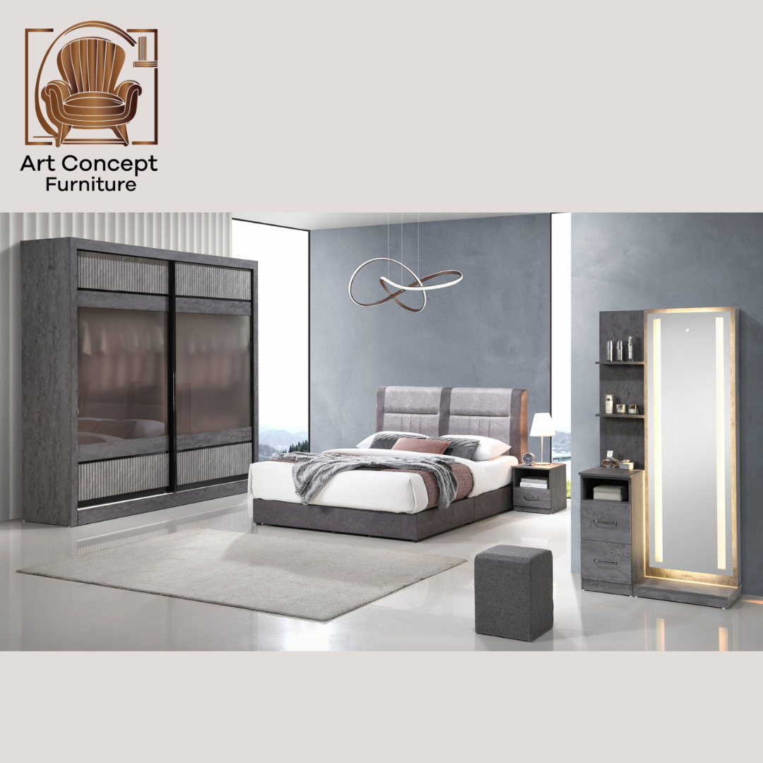 this set includes a plush bed frame, a spacious wardrobe, and matching bedside tables with elegant finishes. The soft headboard provides excellent back support for reading or relaxing in bed, while the carefully selected materials ensure durability and sophistication. This bedroom set is perfect for those who want both comfort and aesthetic appeal in their personal sanctuary.