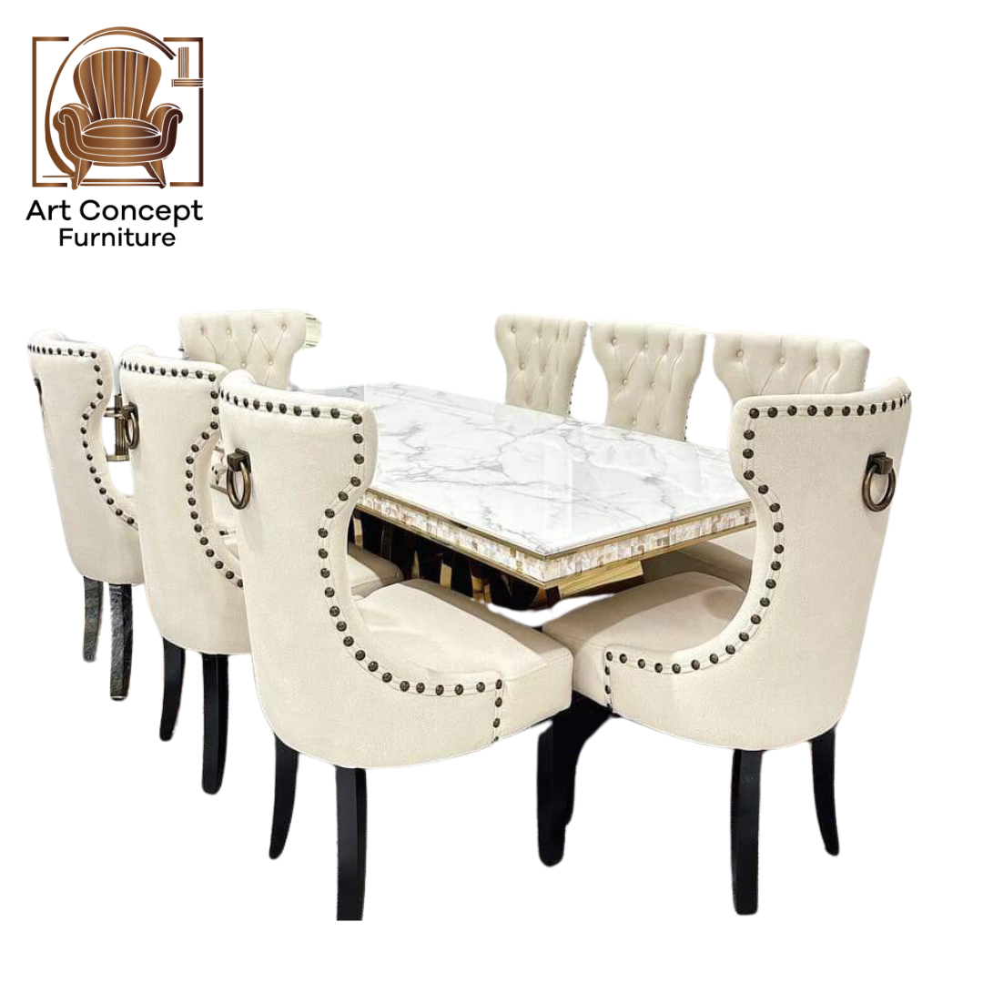 The marble tabletop is uniquely patterned and rests on a solid wooden base with natural finishes. The chairs are designed for comfort and style with wooden frames and soft upholstery. Ideal for both casual meals and elegant dinners, this set brings warmth and class to any Malaysian home.